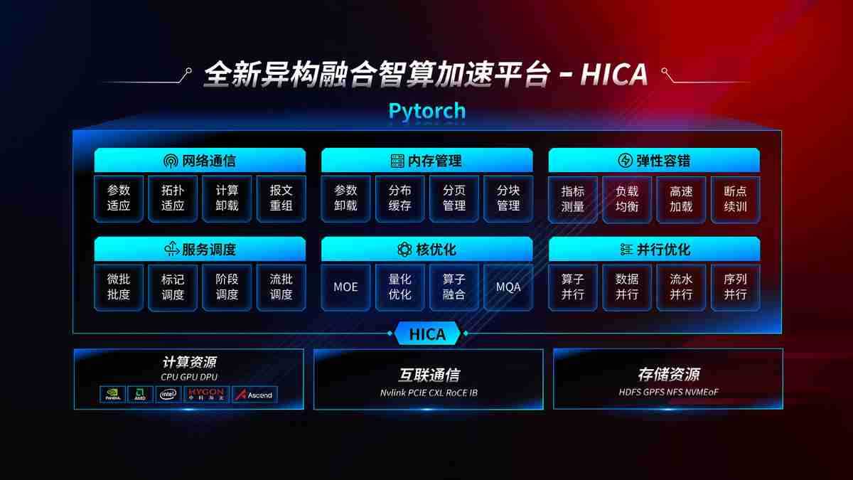 通过自研的服务层、、中间适配层、、、、以及调度编排算法,,,,采用数据并行、、、模型并行等多种并行方式,,,,把并行计算任务进行有效的分解,,使其分别由相应的软件栈和算力资源来承接。。。当GPU资源变化,,,,HICA可以实时动态调度计算子任务并调整模型拓扑和架构,,以充分聚合各种算力资源。。。